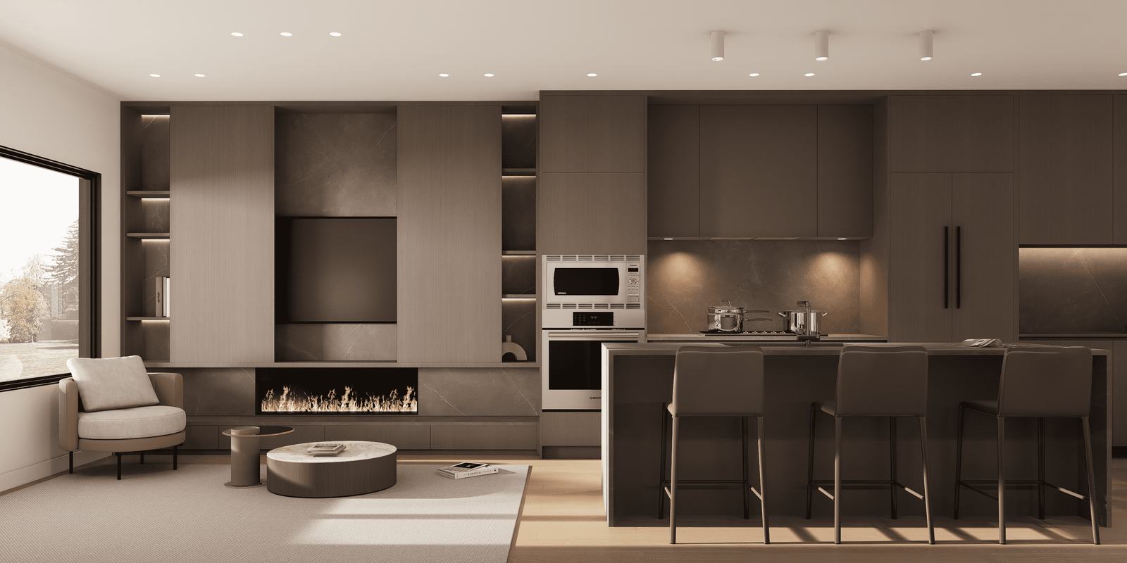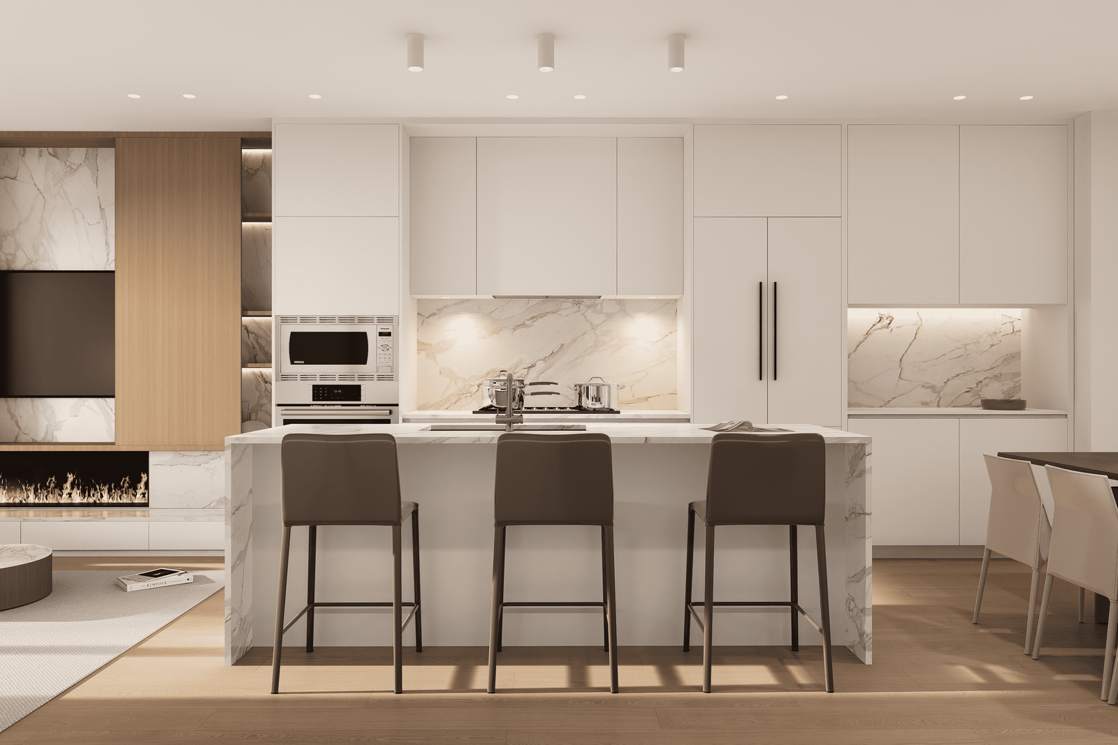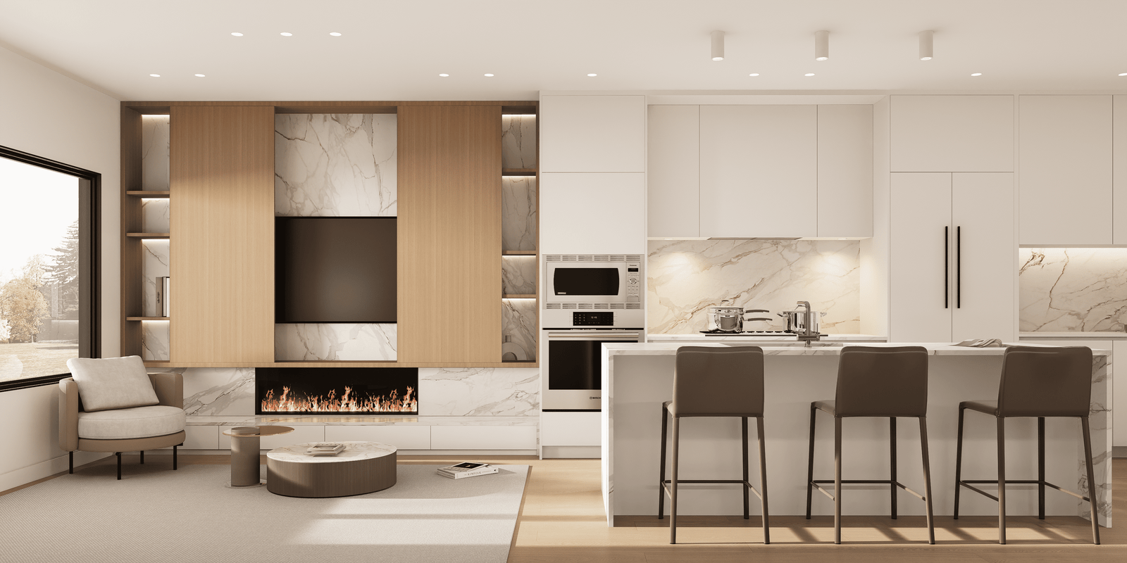Open doors to invite nature into your living experience. Interiors transition to a secluded patio, where you can clearly hear the tumbling waters of the river just beyond the landscaping. Dense planters provide privacy between homes, creating a sanctuary that’s all yours. Comfortably arrange lounging and dining areas, and set up a barbecue, fire pit, and heaters. Opportunities for entertaining family and friends exist year-round, and your own quiet enjoyment of the outdoors is a possibility every day.