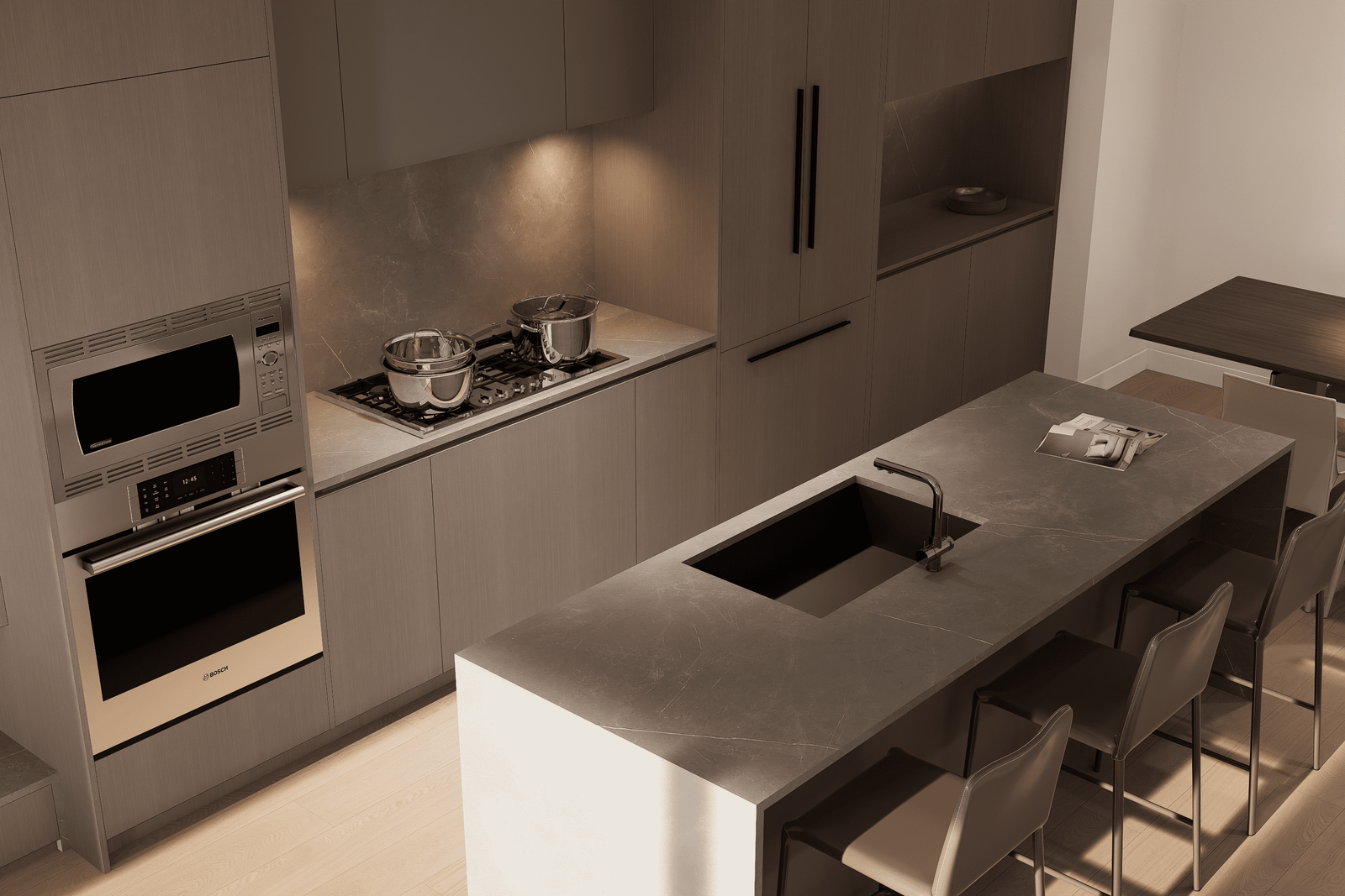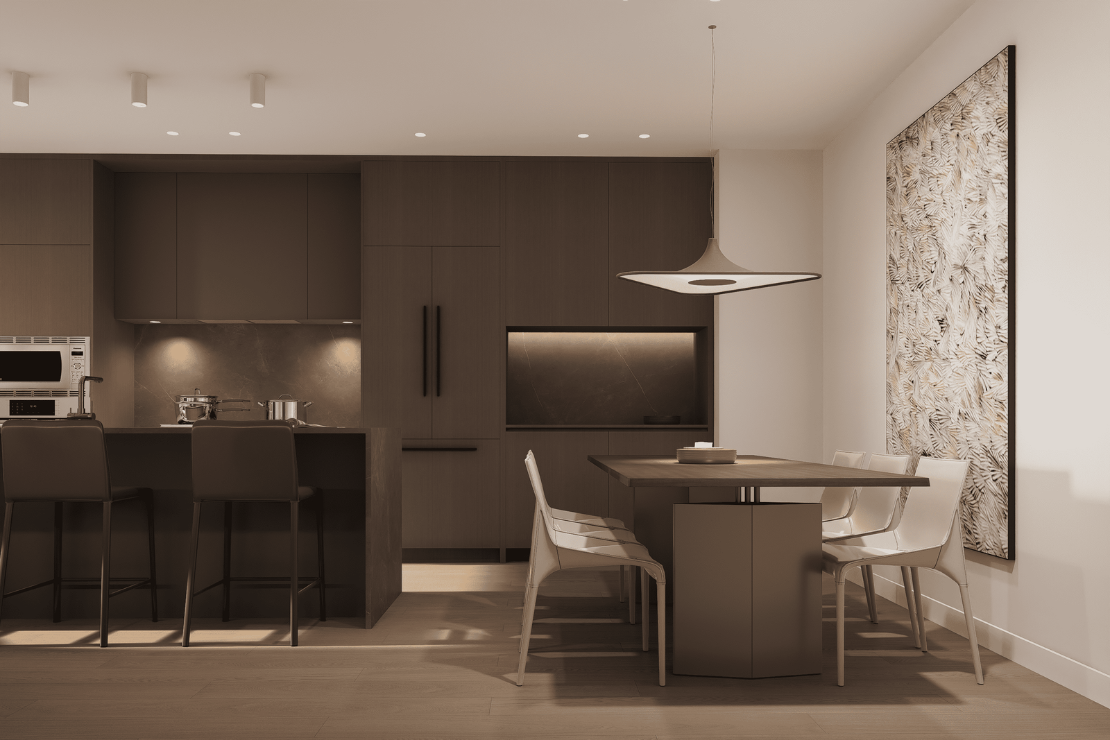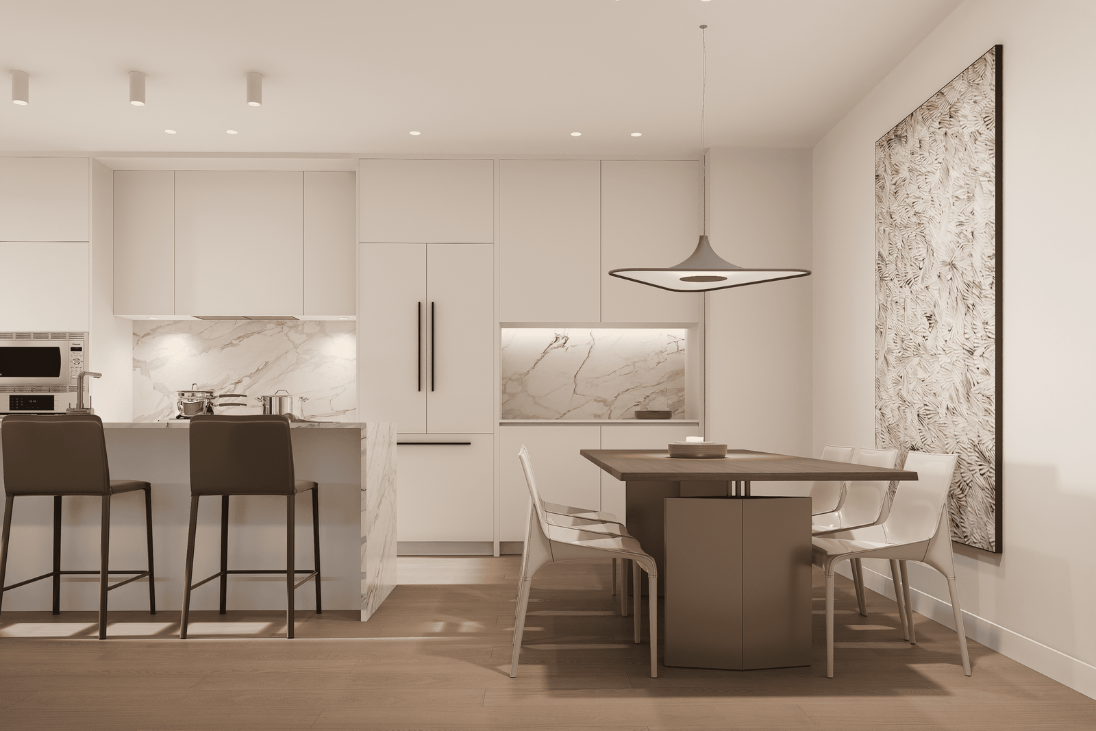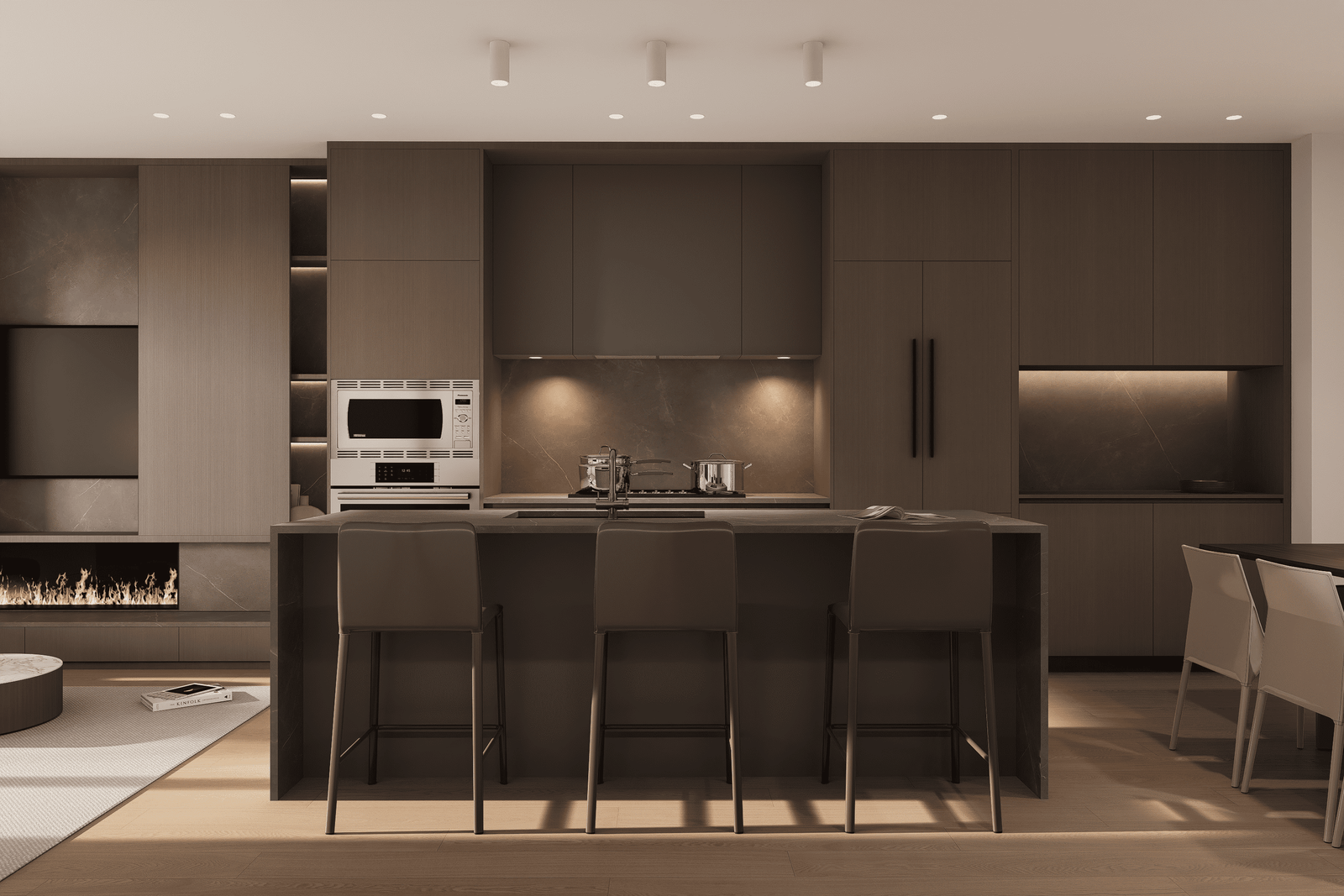 Open doors to invite nature into your living experience. Interiors transition to a secluded patio, where you can clearly hear the tumbling waters of the river just beyond the landscaping. Dense planters provide privacy between homes, creating a sanctuary that’s all yours. Comfortably arrange lounging and dining areas, and set up a barbecue, fire pit, and heaters. Opportunities for entertaining family and friends exist year-round, and your own quiet enjoyment of the outdoors is a possibility every day.